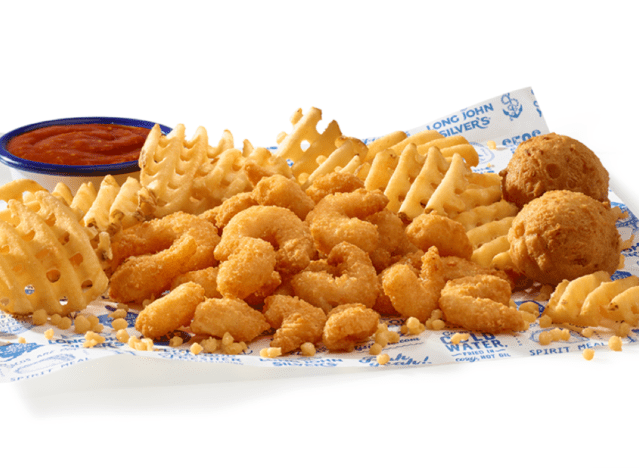 The Fish & Shrimp Platter at Long John Silver’s is $15.29 and perfect for those looking for a hearty, filling option. Each platter contains two pieces of Alaska pollock and six pieces of crispy battered shrimp, served with two individual-sized sides and two hushpuppies. Those who want shrimp and only shrimp can choose the Popcorn Shrimp Basket or the 15 pc Battered Shrimp Share.