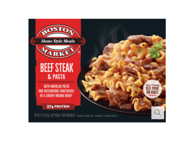 Boston Market® Home Style Meals Beef Steak & Pasta is very close to a stroganoff-type dish, combining mushroom gravy with tender, juicy cuts of beef steak, poured over pasta for the perfect, home style beef steak and pasta dish. “Delicious. The meat has a good quality consistency, and the sauce is perfect,” one Ralphs shopper shared.