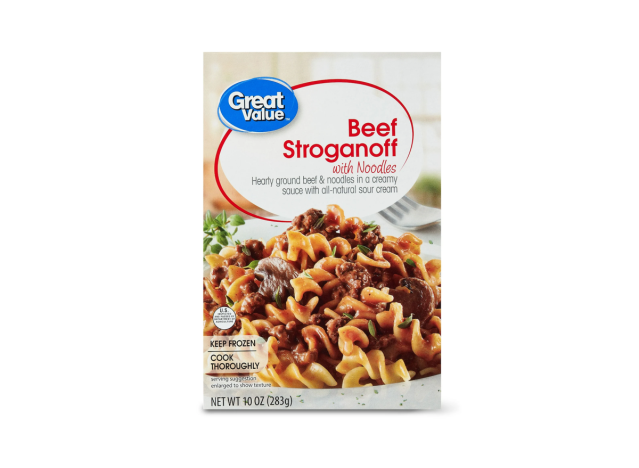 Great Value Beef Stroganoff with Noodles is made with ground beef and noodles in a creamy sour cream sauce. “This might be my favorite frozen ‘TV dinner’ style meal Walmart sells,” one fan said. “I just added a tablespoon of sour cream, and a glug of dark soy sauce after heating, and it was so good I was scraping the bottom of the tray with my spoon.”