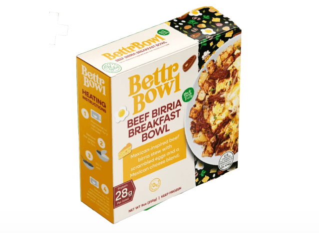 The Bettr Bowl Beef Birria Breakfast Bowl is a breakfast that feels indulgent and comforting but still hits the mark on balance and nutrition, making it a go‑to for busy mornings when you want something more exciting than a basic frozen sandwich. “Bettr Bowl’s Beef Birria Breakfast Bowl brings bold, Mexican-inspired flavor to the frozen aisle with a base of roasted potatoes seasoned with onion, rosemary, sea salt, and black pepper,” Batayneh explains. “The pasture-raised beef birria is simmered with red peppers, onion, garlic, and warming spices like guajillo, ancho, and pasilla chiles, along with cumin, oregano, and bay leaf for a deep, savory flavor.” Batayneh says the “cage-free scrambled eggs add a satisfying texture, while a four-cheese blend of Monterey Jack, cheddar, queso quesadilla, and asadero melts throughout for creamy balance.” She adds, “With 28 grams of protein per bowl, this option delivers bold flavor and substantial protein in a convenient, freezer-ready breakfast.”