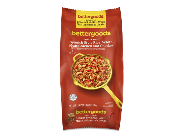 bettergoods Spanish Style Rice, White Meat Chicken and Chorizo Skillet Meal is made with chicken, chorizo, roasted bell peppers, peas, and seasoned rice. “Easy dinner, family all happy,” one shopper shared.