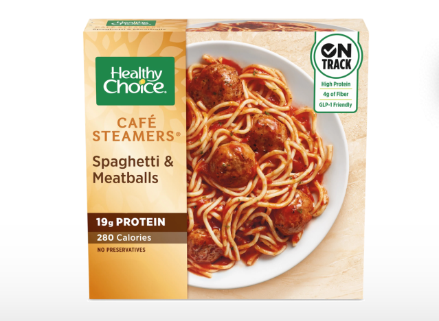 Healthy Choice Café Steamers Spaghetti & Meatballs is a lighter, higher-protein option of meatballs, spaghetti, and marinara sauce. “Healthy Choice Cafe Steamers Spaghetti and Meatballs Bowl delivers 19 gr. of protein. That’s eating pretty healthy. Add a salad and some green beans if you like, these bowls work for lunch or dinner,” one fan said.