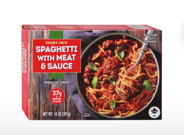 Trader Joe’s Spaghetti with Meat & Sauce is “brimming with tomatoes and the classic combination of beef and pork”, TJs says, and shoppers agree. “Just tried this for dinner. I can say this tastes legit bolognese. Have to get some more to stock 🤤,” one said.
