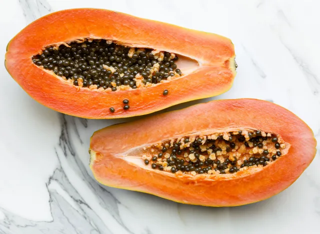 Low in calories and high in fiber, papaya enhances your sense of fullness while aiding in digestion. Per the USDA, 100 grams of raw papaya provides 43 calories and 2 grams of fiber. Additionally, papaya is a rich source of vitamins and enzymes such as papain that research shows can contribute to a healthy metabolism—your body’s calorie-burning engine.