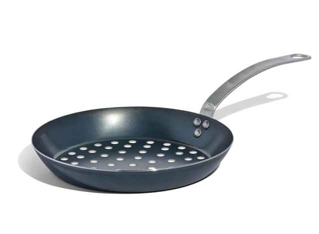 This carbon steel frying pan can withstand heat like cast iron, but it’s much lighter in weight. The pan can withstand up to 1200 degrees in heat so it’s perfect over the campfire, in a pizza oven and on the grill. The holes allow for nice charring on vegetables or whatever you dish up. If you take care of it properly, it should last decades.