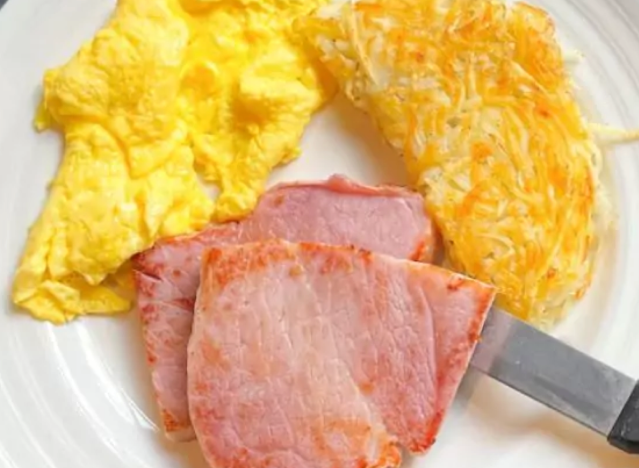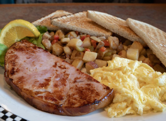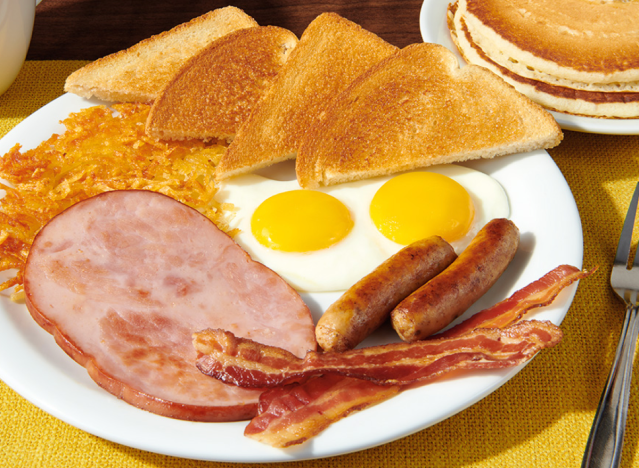 Denny’s has steak and eggs, and also ham steak with eggs. The Lumberjack Slam features grilled ham steaks, bacon, and sausage, served with hash browns, eggs, and toast.