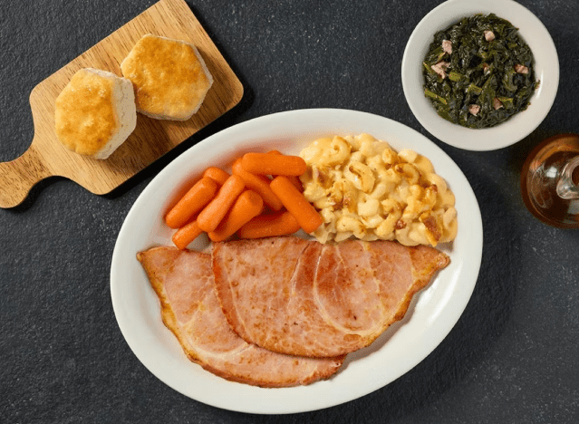 Cracker Barrel offers a thick-sliced barrel-cut bone-in Sugar Ham steak as part of their lunch/dinner menu, which comes with three country sides and biscuits or muffins. They also feature a saltier, dry-cured “Country Ham” option, often available for breakfast or as a side.