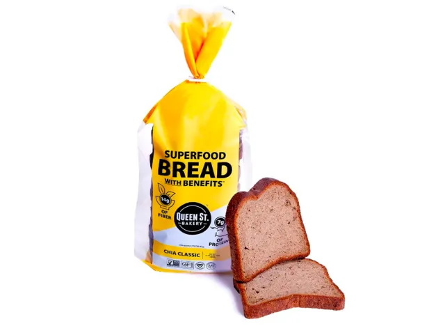 Queen Street Bakery’s chia seed loaf is cut thin enough that each serving is two slices, not one! With 14 grams of fiber per serving, this one tops our list as one of the highest-fiber breads around. Unlike grain-based breads, it gets its epic fiber content from chia flour and white bean flour, making it gluten-free.