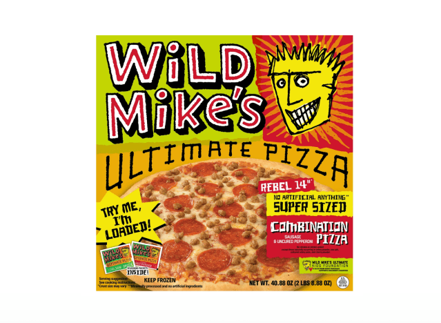 Wild Mike’s Ultimate Pizza Super Sized Combination Pizza is a 2 1/2 pound, 14 inch pizza made with 100% real mozzarella, provolone, Romano, and parmesan cheeses. “100% all natural, no artificial anything. Free from artificial colors, flavors, preservatives, conditioners, relaxers, and more!” the brand promises.