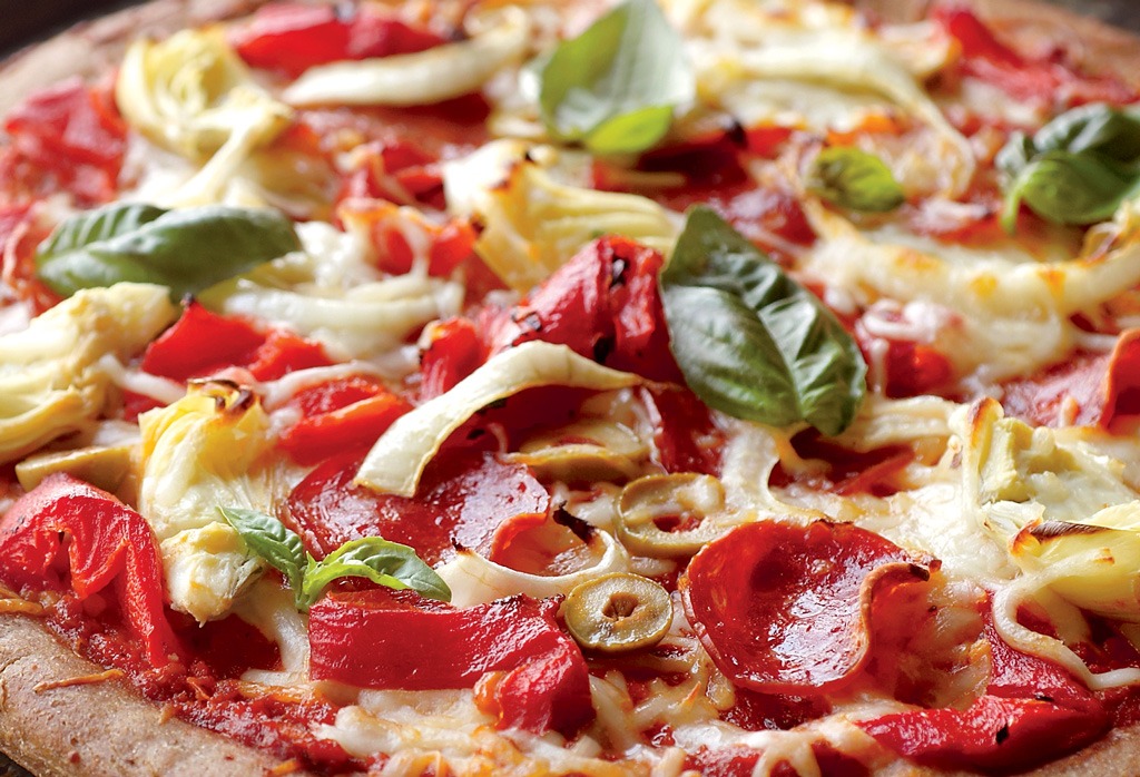 Preheat the oven to 400°F. Cover the crust with sauce and then cheese. Sprinkle with the pepperoni, onion, peppers, olives, garlic, pepper flakes, and artichokes.