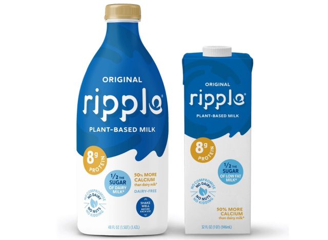 Plenty of protein powders powered are by peas—so it’s no surprise that pea protein can make its way into non-dairy milk, too. Ripple’s Original Plant-Based Milk turns peas into a pourable beverage. “[This] is my go-to recommended non-dairy milk for people with food allergies,” says Jamie Adams, MS, RDN, owner of Mamaste, who says that Ripple is free of dairy, nuts, soy, and gluten.