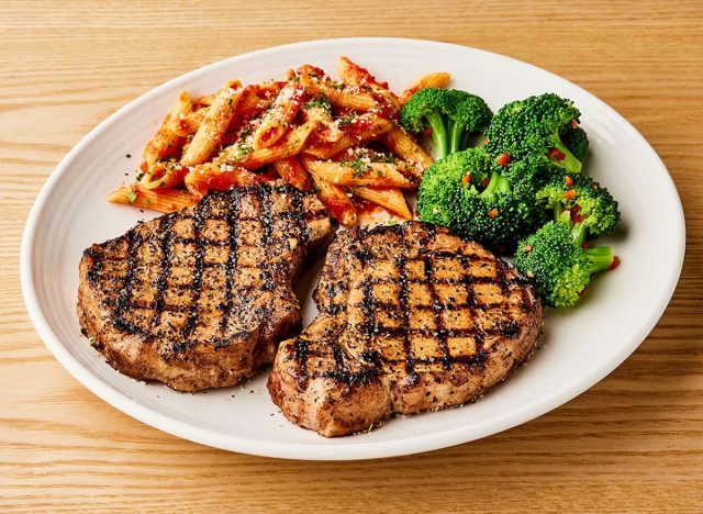 Carrabba’s Italian Grill might be known for their pasta, but according to butchers, it’s also the go-to chain for pork chops. “They’re simply grilled, allowing the natural richness of the meat to shine, and my favorite topping is the Spicy Sicilian Butter, which adds just the right kick without overwhelming the pork,” says Chef Thomas Odermatt, Founder of Roli Roti Food Trucks and Butcher’s Bone Broth. He adds, “For me, pork chops are comfort food at its finest—best served with mashed potatoes, roasted vegetables, or even caramelized onions. They remind me of family meals, tradition, and the simple pleasure of good meat done well.” But he’s not the only butcher/chef who raves about the dish at Carrabba’s Italian Grill. It’s also where Brad Baych Chef / Butcher / Content Creator at Butcher Wizard and author of Primal Cuts: A Butcher’s Guide to Selecting, Preparing, and Perfecting Beef goes when he’s in the mood for tasting chops. “Grilling the chops bone in really helps keep the meat juicy,” he says. “Pork is a blank canvas so it takes sauces and rubs very well. My tip is to try to get the kitchen to cook it medium to retain as much moisture as possible.”