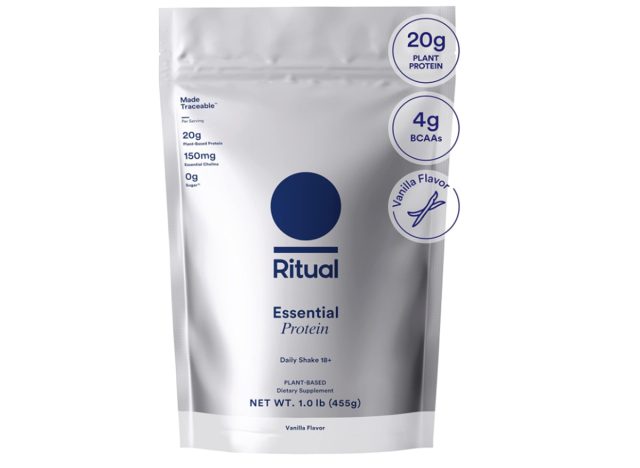 The protein powder provides 20 grams of protein from organic pea protein and meets 10% of the daily value for fiber. Ritual’s protein powder is designed for muscle-building, providing 4 grams of branched-chain amino acids, the essential amino acids necessary for muscle protein synthesis. It also has added L-methionine to improve its amino acid profile so it more closely resembles whey protein.
