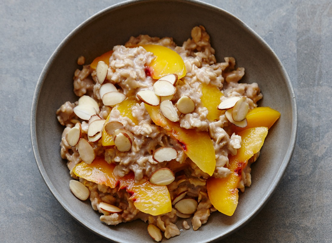 Just before the oats are cooked, take off the heat and stir in cinnamon, followed by the chopped peaches. Top with flaked almonds.