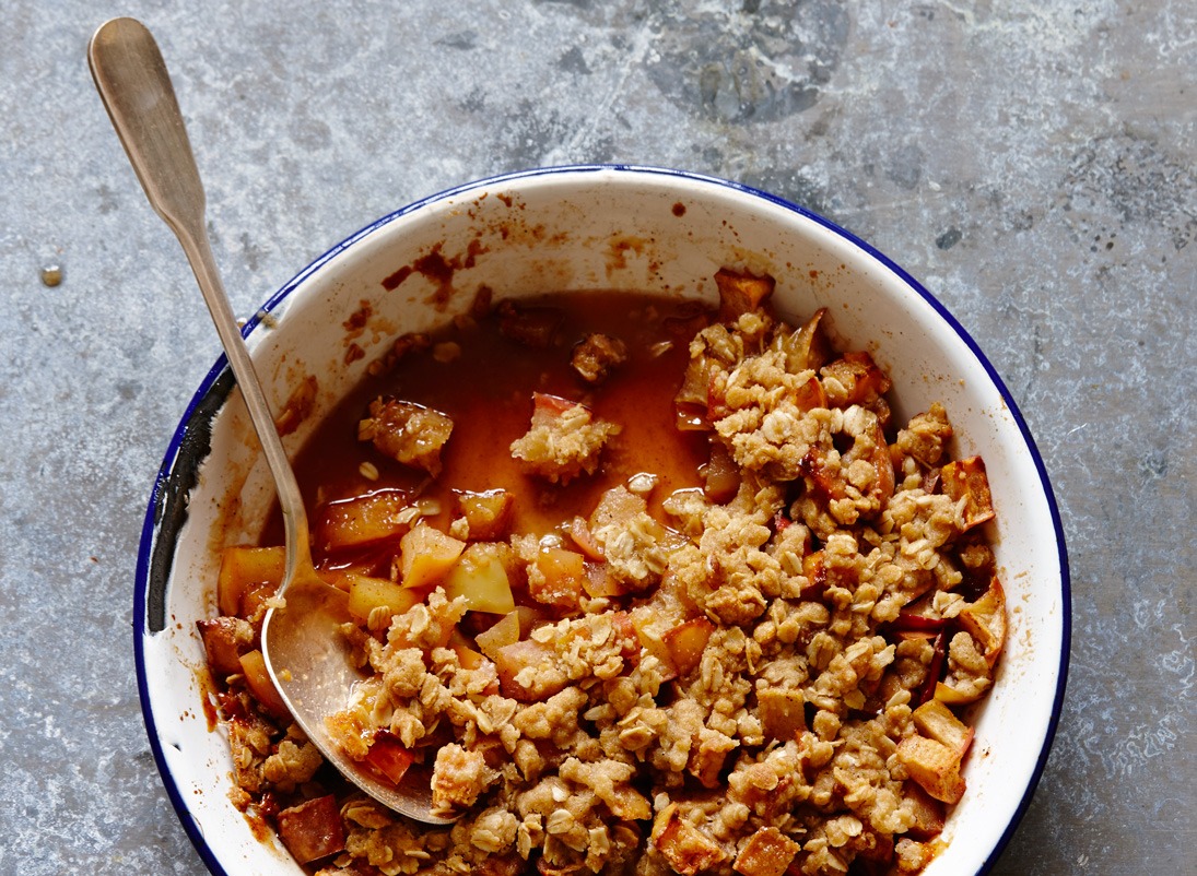 Place the crumble topping ingredients in a separate bowl, and mix with your hands, pinching together clumps.