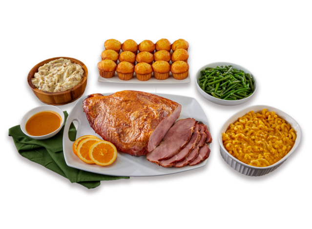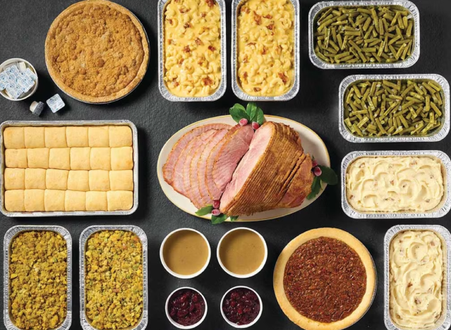 Cracker Barrel has a Holiday Ham Heat & Serve Feast that serves eight people. Each meal contains Spiral-Sliced Sugar Cured Ham, Cornbread Dressing, Roasted Gravy, Cranberry Relish, Macaroni & Cheese, Mashed Potatoes, Green Beans, Sweet Yeast Rolls. Dessert is Apple Streusel Pie & Pecan Pie.