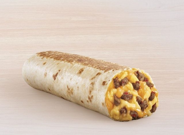 “Coming in with the lowest calorie count, the Cheesy Toasted Breakfast Burrito with Sausage has 350 calories and is lower in saturated fat and sodium than many of the other breakfast options at Taco Bell,” says Goodson. “With 6 grams of saturated fat and 770 milligrams of sodium, it’s not a low-sodium food, but lower than others.”
