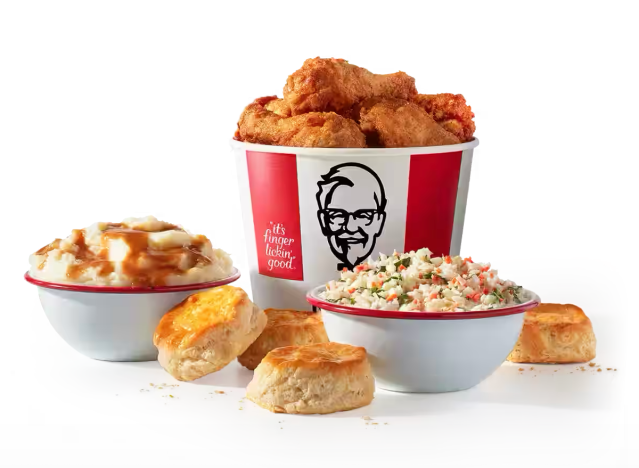 KFC Family Feast Bundles come with the chain’s famous bucket of chicken, seasoned with 11 herbs and spices. You can get an eight-, 12-, or 16-piece meal served in the chain’s famous red-and-white bucket, starting at around $20. “Choose between Variety Bucket (2 drums, 2 thighs, 2 breasts, and 2 wings) or our all-dark meat Drum & Thigh Bucket (4 drums and 4 thighs),” says KFC. One diner calls the bucket experience at KFC “a blast.”