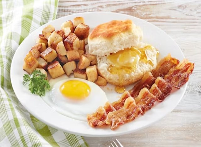 Bob Evans serves up farm-style breakfasts at affordable prices. For $7.99, get the Griddle Stacker, a Sausage patty, American cheese, bacon, and a farm-fresh fried egg between three mini hotcakes, topped with powdered sugar and served with black pepper, maple honey, and hash browns, home fries, or fresh seasonal fruit. You can also order the Mini Sampler for $5.99, one farm-fresh egg cooked-to-order, with your choice of hash browns, home fries, or fresh-cut fruit, plus your choice of premium breakfast meat, two sausage links, or two hardwood-smoked bacon strips, and a freshly baked biscuit, or the Country Biscuit Breakfast, $7.99, a buttermilk biscuit topped with one farm-fresh egg cooked-to-order, crumbled Bob Evans® sausage, country gravy, and cheddar cheese. Served with hash browns or home fries.