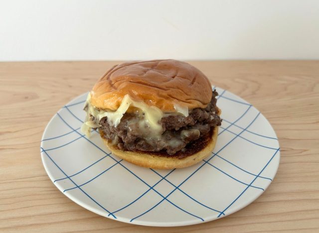 The CEO is the only burger on the menu that comes with the more expensive Wagyu beef by default. The patties are actually a blend of premium Wagyu cuts, so you know the chain is pegging this as one of its most elevated creations, and the price reflects this (it’s the most expensive burger on the menu). Besides that, the CEO included aged Swiss cheese, homemade candied bacon-tomato jam, and a garlic truffle aioli sauce on a potato bun. It cost $12.99.