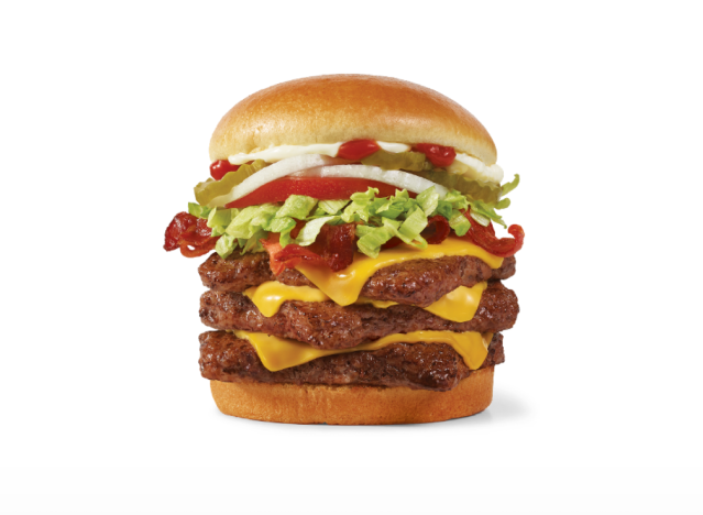 Wendy’s Big Bacon Classic Triple contains 1140 calories, the highest-calorie burger on the menu. So what’s on it (or in it)? Three quarters of a pound of fresh, never-frozen beef, Applewood smoked bacon, American cheese, crisp lettuce, tomato, pickle, ketchup, mayo, and onion on a toasted bun.