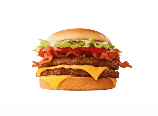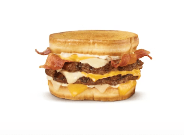 The Double Grilled Cheese Bacon Burger at Hardee’s contains 1230 calories for the burger alone. This menu item is packed with two 100% USA Angus Beef Patties, layered with crispy cherrywood smoked bacon, melty American and Swiss cheese, mayonnaise, served on perfectly toasted, buttery sourdough bread. The Double Hardee’s Frisco (1020 calories) comes in at a close second.
