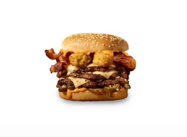 The Triple El Diablo at Carl’s Jr. contains 1430 cals and is worthy of its name. This big burger is packed with three charbroiled all-beef patties, two strips of Cherrywood bacon, jalapeno poppers, Pepper Jack cheese, pickled jalapeno coins, and a fiery habanero ranch sauce on a seeded bun. I’m not going to lie, that actually sounds amazing.