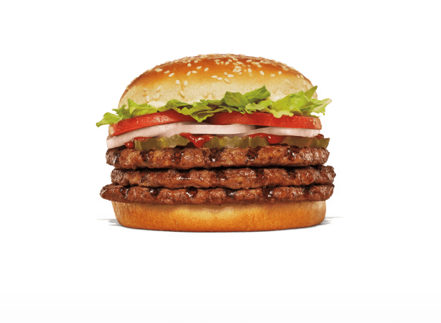 Burger King‘s Triple Whopper With Bacon and Cheese is a whopping (sorry, I had to) 1,350 calories. This hefty menu item contains three ¼ lb* flame-grilled beef patties with juicy tomatoes, crisp lettuce, creamy mayonnaise, ketchup, crunchy pickles, and sliced white onions on a toasted sesame seed bun. This would be a big burger even without the bacon and cheese.