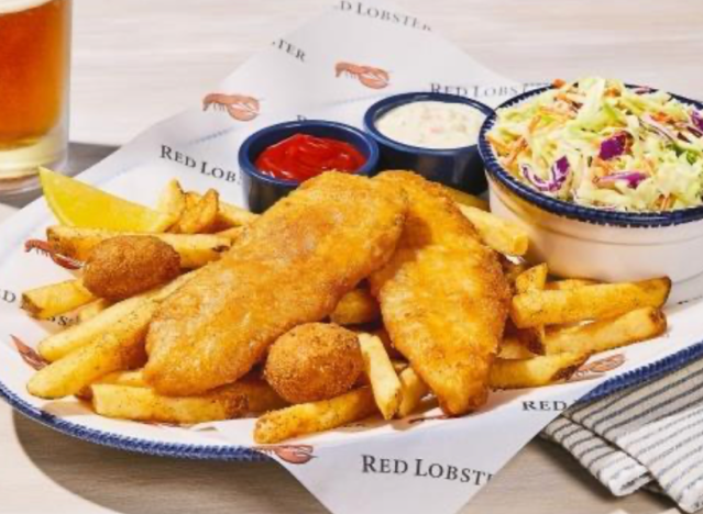 Red Lobster Fish and Chips is just $19.99 and includes beer-battered wild-caught cod, Chesapeake fries, coleslaw, and hush puppies. “Red Lobster’s Fish and Chips soooooo gooood. About $20 and my curbside order was ready in 15 minutes!!! Came with biscuits, hush puppies, seasoned fries, slaw, and a huge piece of fish! If you havnt been by in a while, ya need to!” a Facebooker declares. “Batter was not too thick, fish is cooked well & tasty! Another bite of the fish with malt vinegar, better!” a Yelper says.