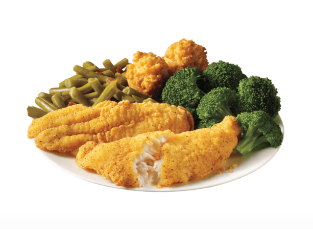 Captain D’s Hand-Breaded Catfish plate comes with tender catfish, hand-breaded in a signature southern-style breading and served with your choice of two sides and hush puppies. The chain also has similar options like the Southern-Style White Fish, also served with two sides and hush puppies.