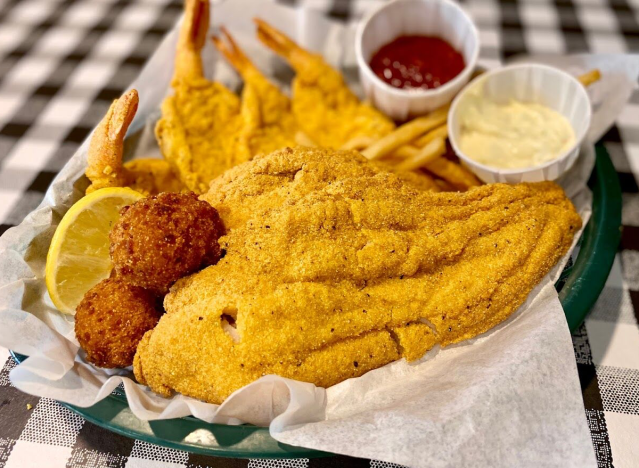 Diners at seafood chain Flying Fish can enjoy fried catfish baskets, po’boys, and platters with a basket of hush puppies on the side. “I ate a catfish po’boy on garlic bread, and the Mrs. ordered shrimp. Sides were fries and hush puppies,” one fan said. “We were thoroughly [impressed] with the quality and flavor of the food. This place is a winner.”