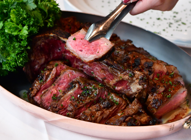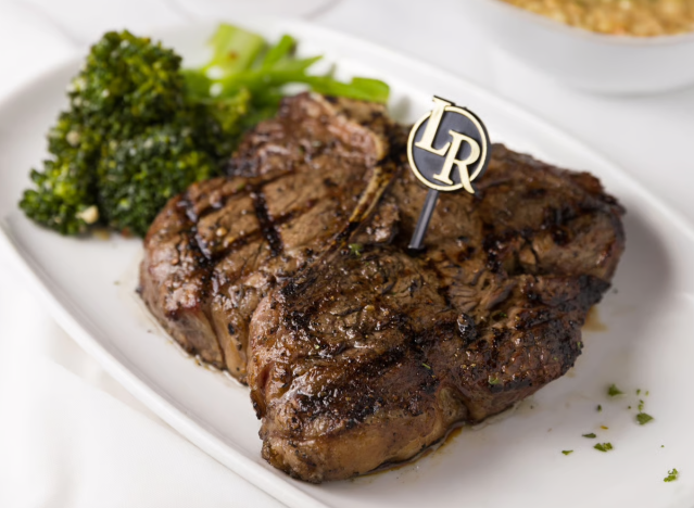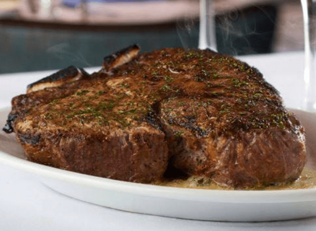 Ruth’s Chris diners can enjoy the chain’s iconic 40 oz. Porterhouse For Two: “On one side of the bone, you’ll find a melt-in-your-mouth Filet, arguably the most tender of all high-end cuts of beef. On the other side, a firm, flavor-filled New York Strip – our founder’s favorite,” Ruth’s Chris says. Pair it with the restaurant’s Garlic Mashed Potatoes (smooth and creamy house-made mashed potatoes with hints of roasted garlic) and you’re all set.