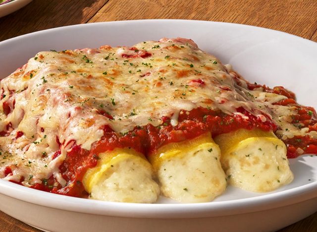 Fazoli’s had stuffed shells, but only as a limited-time menu that ended Feb 2, 2026. “Fazoli’s stuffed shells leaned into classic comfort with a slightly indulgent, fast-casual twist,” Chef Melanie explains. “The dish featured large pasta shells filled with a rich, creamy cheese blend—typically ricotta, mozzarella, and Parmesan—then baked in marinara and topped with additional melted cheese.” No word yet on whether the chain will bring the dish back, but we can only hope.