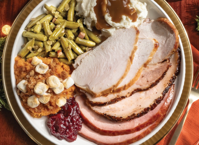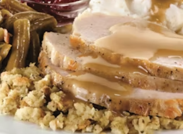 Bob Evans regularly has their slow roasted turkey and stuffing, and customers can taste the attention to detail. The slow roasted turkey is cooked for hours with a flavorful combination of spices and herbs. In addition to the dressing, it comes with a hearty gravy, tart cranberry relish, dinner rolls, and two sides.