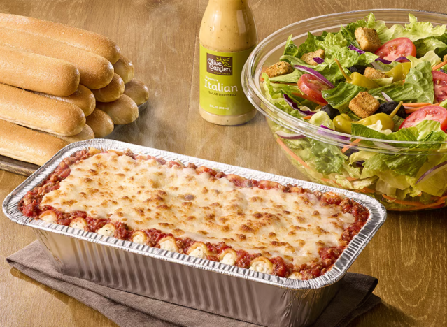 Olive Garden is famous for its all-you-can-eat soup, salad, and breadsticks that can fill up the family before the main meal is even served. You can also order bundles for takeout, like the Family-Style Lasagna Bundle for $58.99. These family-style meals include enough main course to feed up to six people, a house salad, and a dozen breadsticks, averaging under $ 10 per person.