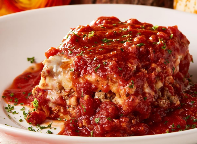 The Old Spaghetti Factory serves up “Famous Baked Lasagna” made with noodles, marinara sauce, ground beef and pork, and four cheeses. “The lasagna actually looked quite good, if a bit saucy. I like that the pasta all held its shape really well, and the marinara—while excessive—appeared fresh and flavorful,” says Kirouac, who notes that “it tastes like a spot-on classic lasagna. It’s slightly meaty, super saucy, and the pasta all holds its own.” The chain offers a “Factory Family Feast” for about $40–$45, featuring their signature Baked Lasagna (layered with meat sauce and four cheeses), which serves 4-6 people, including salad and bread.