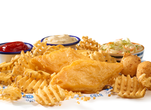 Long John Silver’s battered fish is an iconic, light, and crispy deep-fried dish. Diners love the wild-caught Alaska Pollock dipped in a specialized batter, and it’s so popular that there are tons of copycat recipes online. Don’t forget to order the signature creamy, white cheddar mac and cheese if you find it on the menu. It is topped with their famous fried batter “Crumblies”.