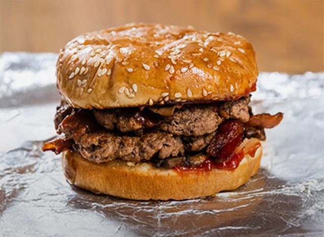 Carl’s Jr. isn’t messing around when it comes to big, beautiful burgers: The Triple Western Bacon Cheeseburger is made with three charbroiled all-beef patties, two strips of Cherrywood bacon, melted American cheese, crispy onion rings, and tangy BBQ Sauce on a seeded bun. The Triple El Diablo is another showstopper containing three charbroiled all-beef patties, two strips of Cherrywood bacon, jalapeno poppers, Pepper Jack cheese, pickled jalapeno coins and habanero ranch sauce, also on a seeded bun.