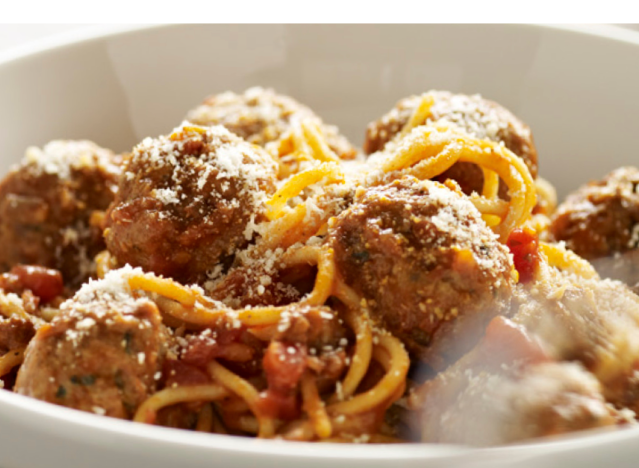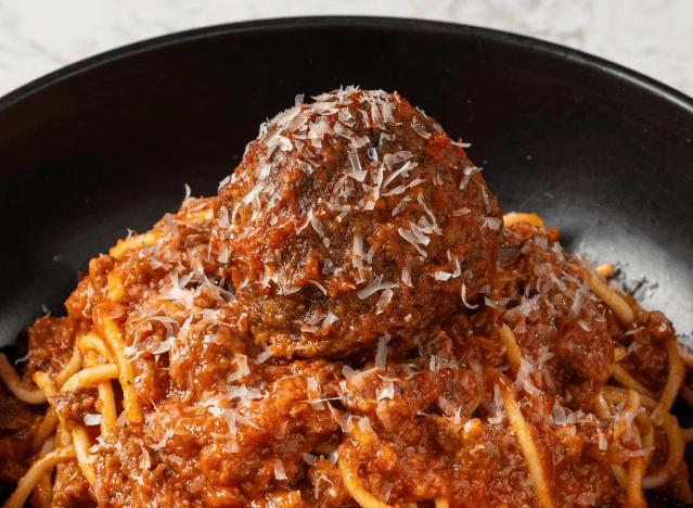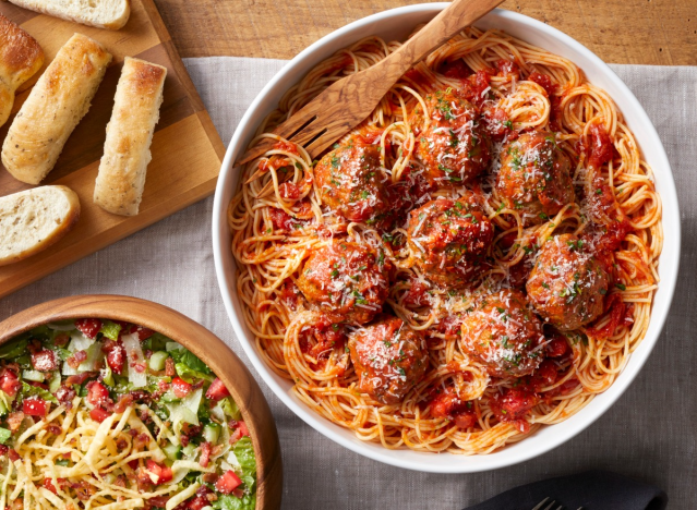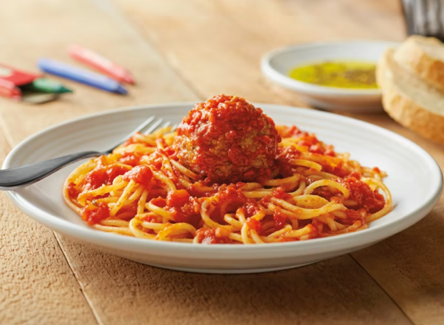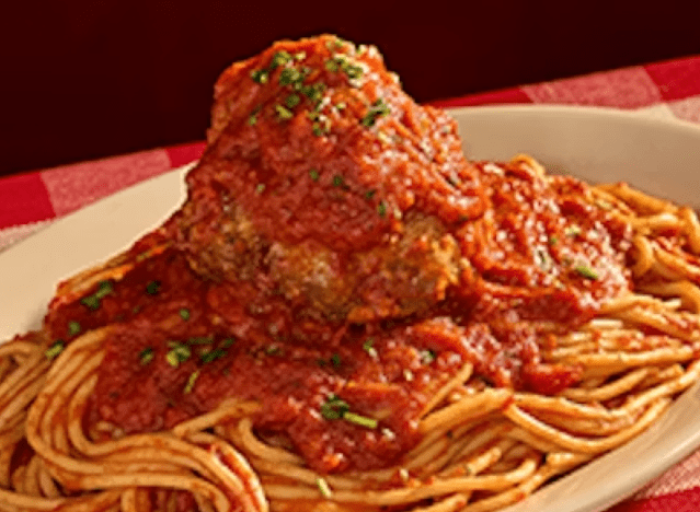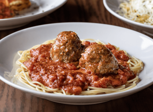 Romano’s Macaroni Grill offers an upscale twist with all-beef meatballs, roasted garlic, and a rich pomodoro sauce. The spaghetti and meatballs is “just like Mom used to make,” the restaurant recently shared on social media. “Our recipe is crafted with house-made beef, veal, pork + ricotta meatballs, romano, and spaghetti.”