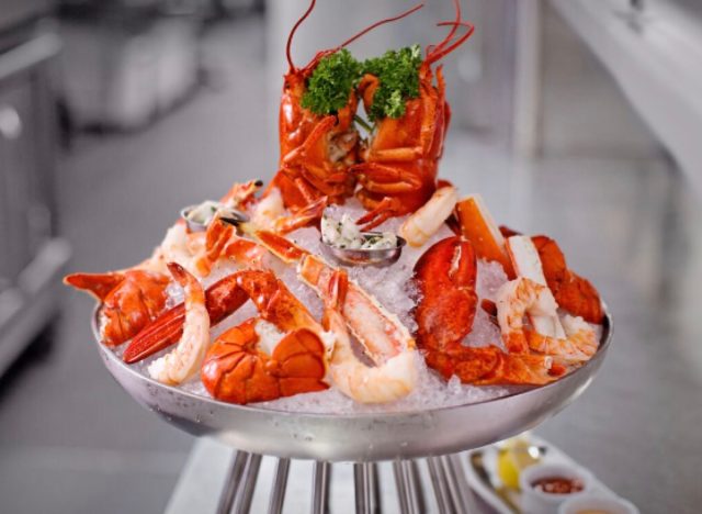 Ocean Prime has a “Smoking” Shellfish Tower containing Maine lobster, King crab legs, shrimp cocktail and more. The chain even shows how to make their iconic seafood towers at home. “Carefully stack your tower, ensuring each layer is stable and beautifully displayed. Serve with classic accompaniments like cocktail sauce, mignonette, lemon wedges, and melted butter,” says Corporate Chef Jason Shelley.