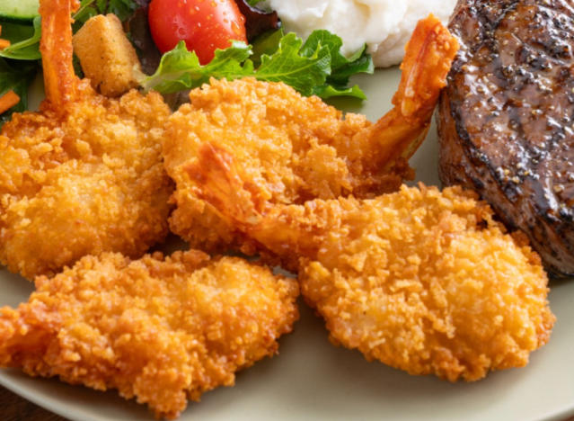 Outback Steakhouse serves up generous portions of shrimp, like the Bloomin’ Fried Shrimp appetizer. “All the spices and flavor that make our Bloomin’ Onion on tender, bite-sized shrimp. Hand breaded and cooked until golden brown and crispy, then drizzled and served with our spicy bloom sauce,” the chain says.