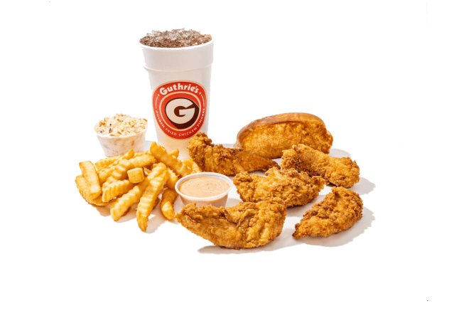 Guthrie’s has a huge bucket of fried chicken on the menu. “If you’re having a party, or you just really love chicken fingers, then the ‘GUT BUCKET’ is the way to go,” the chain says. “25 of our perfectly golden fried chicken fingers and lots of our signature sauce. Or, level it up to a Family Meal and add a bucket of fries, 4 slices of toast, 4 servings of our slaw, and a gallon of our signature sweet tea.”