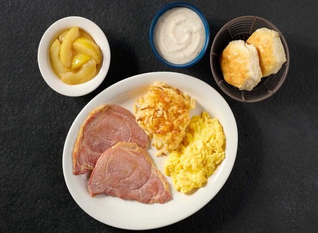 Cracker Barrel used to offer ham on the dinner menu but doesn’t anymore, but luckily the restaurant does breakfast all day. Diners can enjoy meals like The Country Boy Breakfast, which comes with three eggs and the choice of sugar cured or country ham. Each order is served with biscuits and gravy and two classic sides.