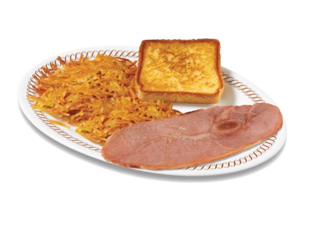 The Country Ham Dinner at Waffle House is a must-have menu item. Each plate includes one 5oz slice of country ham, a double order of hashbrowns and 1 slice of grilled Texas toast. Guests can choose to top their Country Ham with grilled onions, American cheese, grilled tomatoes, jalapeño peppers, grilled mushrooms and more.