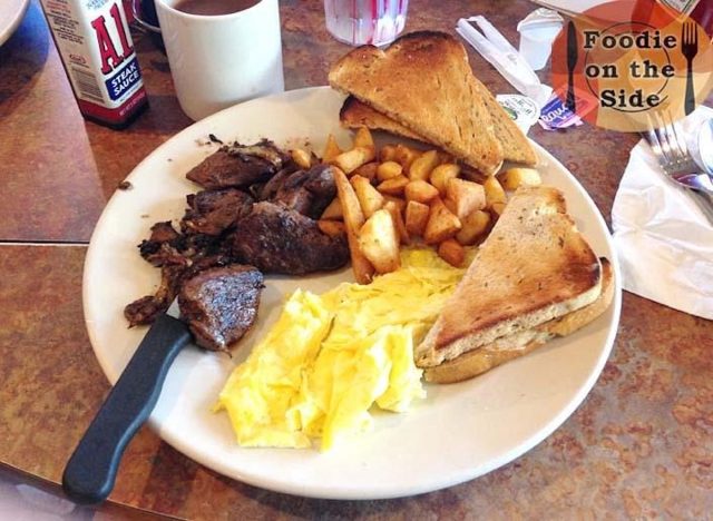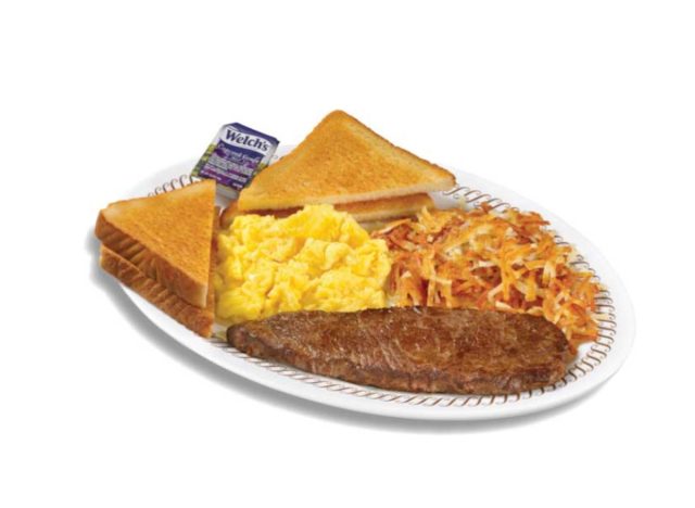 Waffle House is a Southern staple serving ribeye steak with eggs, cooked fresh to order. The Sirloin & Eggs Breakfast comes with USDA Choice Sirloin Steak (5-oz); Two Scrambled Eggs with Toast & Jelly; choice of Grits, Hashbrowns or Sliced Tomatoes’ “Ive gotten it a few times! It’s definitely a 24 hour diner steak, but as far as 24 hour diner steaks go, I like it!” one diner shared.