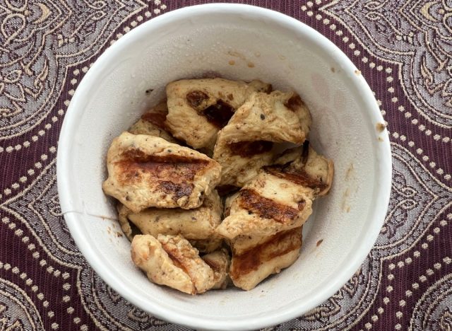 The look: If you’re not comparing these to other menu items, they look like well-seasoned pieces of grilled chicken with thick grill marks. On the other hand, if you’re comparing these to their competition, they look a bit boring and bland.