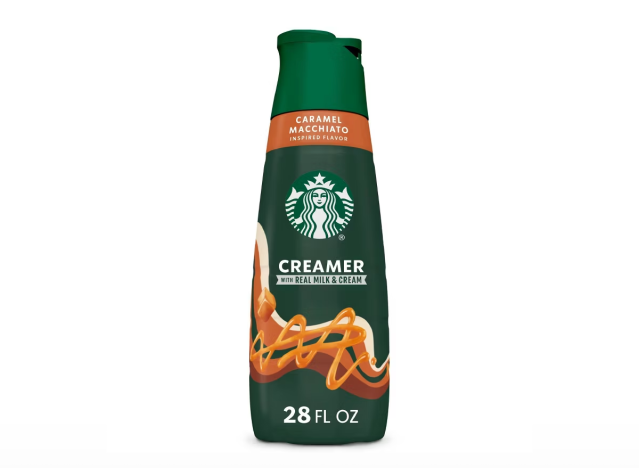 Starbucks Caramel Macchiato is calorie-dense with processed additives. The line of Starbucks creamers, designed to taste like the expensive drinks at the coffee shop, “tends to be higher in sugar and calories per serving, so they can add up quickly if you’re using multiple servings per day,” she says.