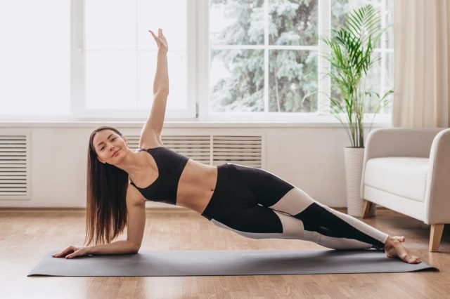 - Start in a side plank with your right forearm on the ground and left arm extended toward the ceiling.