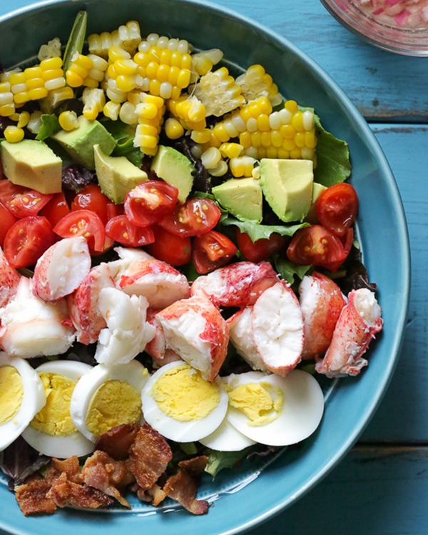 Give your cobb a makeover with Maine's stable seafood and fresh corn. Although not as rich in omega-3s, lobster maintains a solid protein level (hence the whopping 41 grams in this recipe). You won't find that in you average cobb salad.