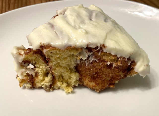 The look: At first glance, this bakery item looks like a cake, but it’s really six huge cinnamon rolls coated in white icing. It looks like a sugar lover’s dream come true. As I cut a giant slice, I could see all of the cinnamon swirls within.